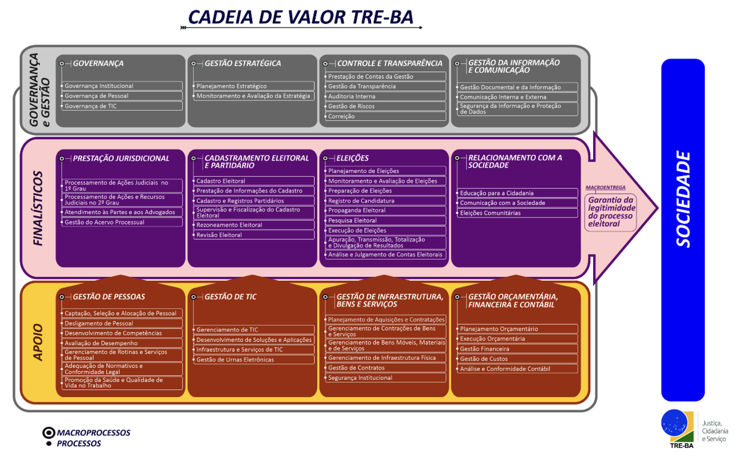 A Cadeia de Valor do TRE-BA (2021–2026) é o referencial para identificar os processos organizacionais, organizada em três macroáreas: