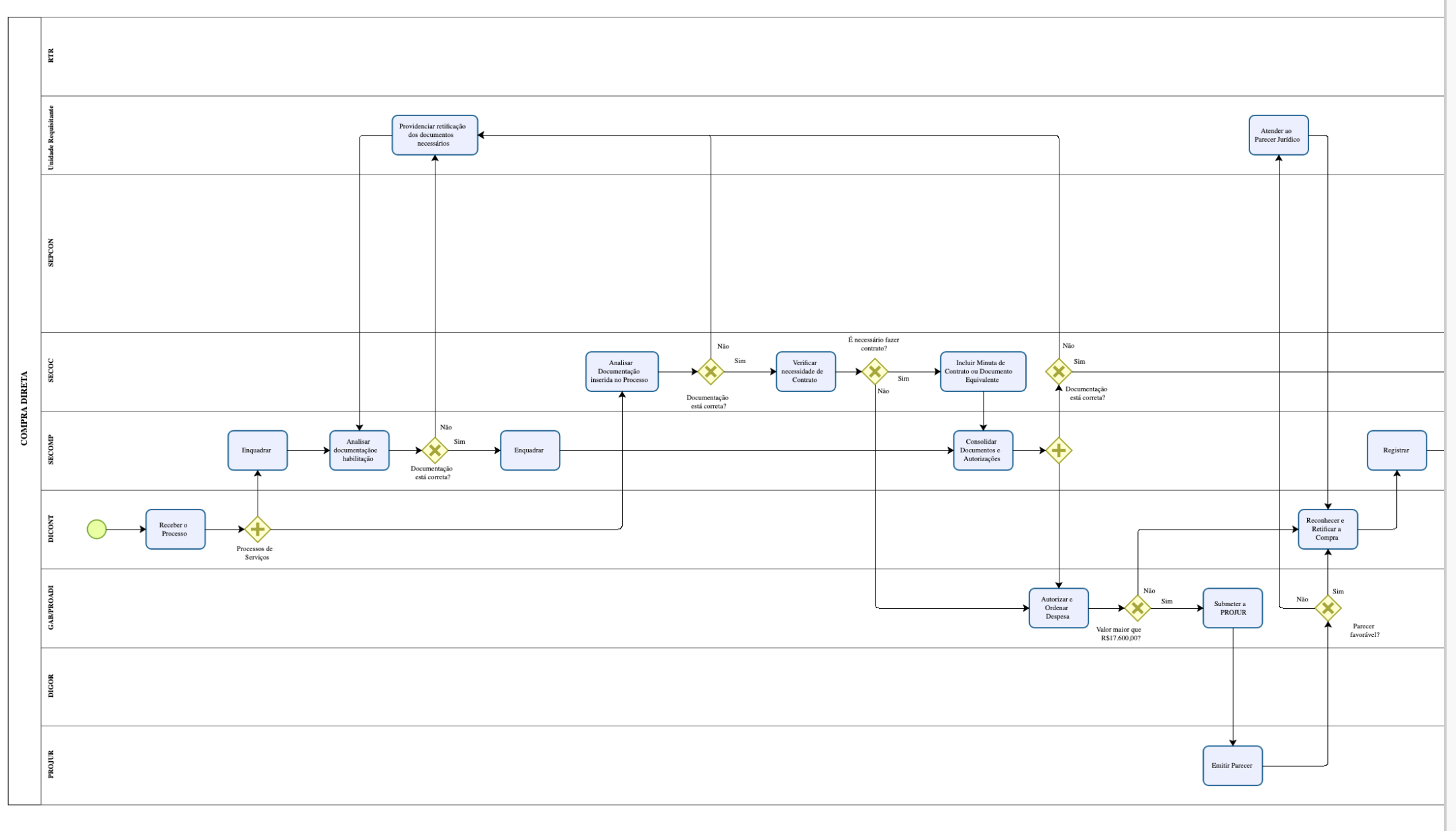 - Descrição: A área de Compras Diretas recebe a documentação e faz uma análise inicial para verificar se está completa e em conformidade para prosseguir com a aquisição.