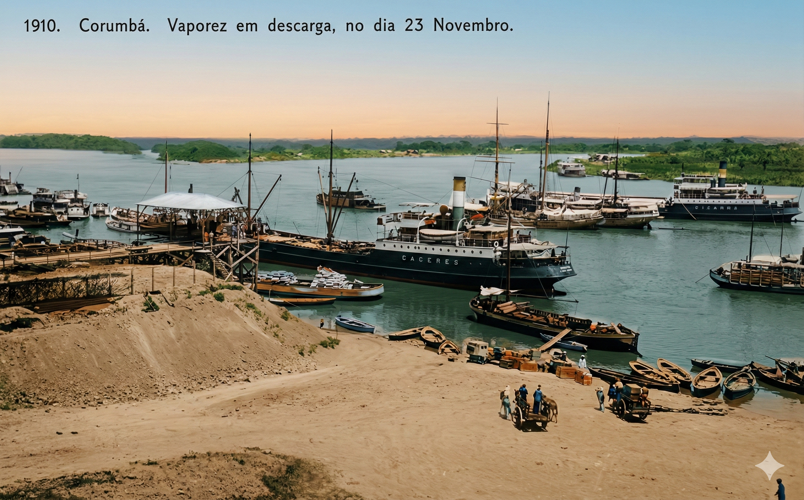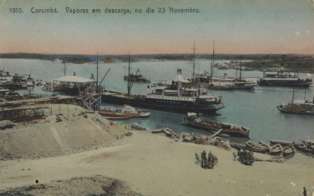 Fotografia do Porto de Corumbá (MS) em 1910, mostrando vapores em descarga no Rio Paraguai, um importante registro do desenvolvimento do interior do Brasil.